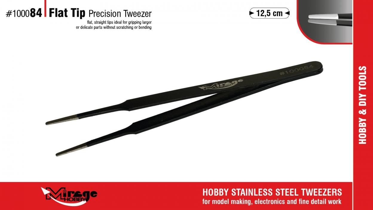 Seria Mirage Hobby Precision Tweezers to seria wysokiej jakości pęset wykonanych ze stali nierdzewnej, zaprojektowanych do precyzyjnej pracy z drobnymi i delikatnymi elementami. Pęsety zapewniają doskonałą kontrolę, stabilny chwyt oraz komfort pracy podczas montażu, malowania i pozycjonowania detali. Każdy model w serii został opracowany z myślą o konkretnym zastosowaniu - od bardzo drobnych elementów, przez części fototrawione, aż po pracę w trudno dostępnych miejscach. Cechy pęset Mirage Hobby Precision Tweezers: stal nierdzewna - trwałość i odporność na korozję precyzyjnie spasowane końcówki wysoka kontrola chwytu ergonomiczny kształt przeznaczone do modelarstwa, elektroniki i prac precyzyjnych. MIRAGE 100084 PĘSETA FLAT TIP PRECISION TWEEZER 12,5cm to Pęseta z płaskimi końcówkami. Płaskie końcówki umożliwiają chwytanie większych lub delikatnych elementów bez ich zarysowania. większe detale delikatne elementy powierzchniowe prace wymagające równomiernego nacisku