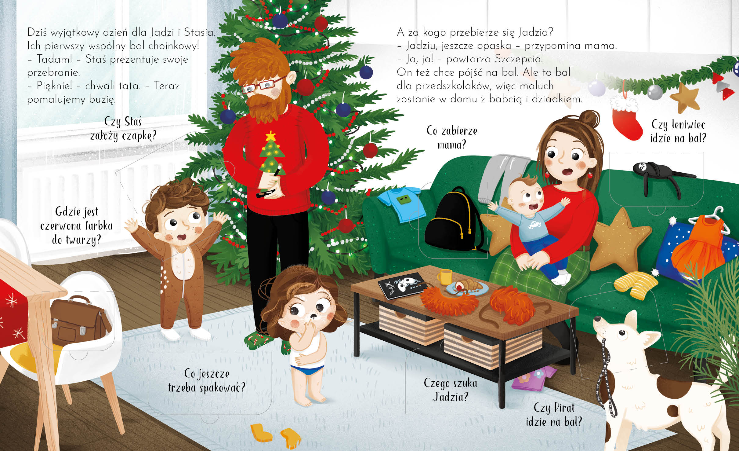 Nadeszły święta! W przedszkolu Jadzi i Stasia Pętelków odbędzie się wielki bal choinkowy. Dzieci włożą zabawne kostiumy, będą tańczyć i zajadać smakołyki. Ale najbardziej nie mogą się doczekać spotkania z Mikołajem! Za kogo przebiorą się przedszkolaki? Czy leniwiec też pójdzie na bal? Czy Mikołaj przyniesie prezenty? Jaką niespodziankę sprawi dzieciom tata? Czytajcie i otwierajcie okienka, żeby się tego dowiedzieć.