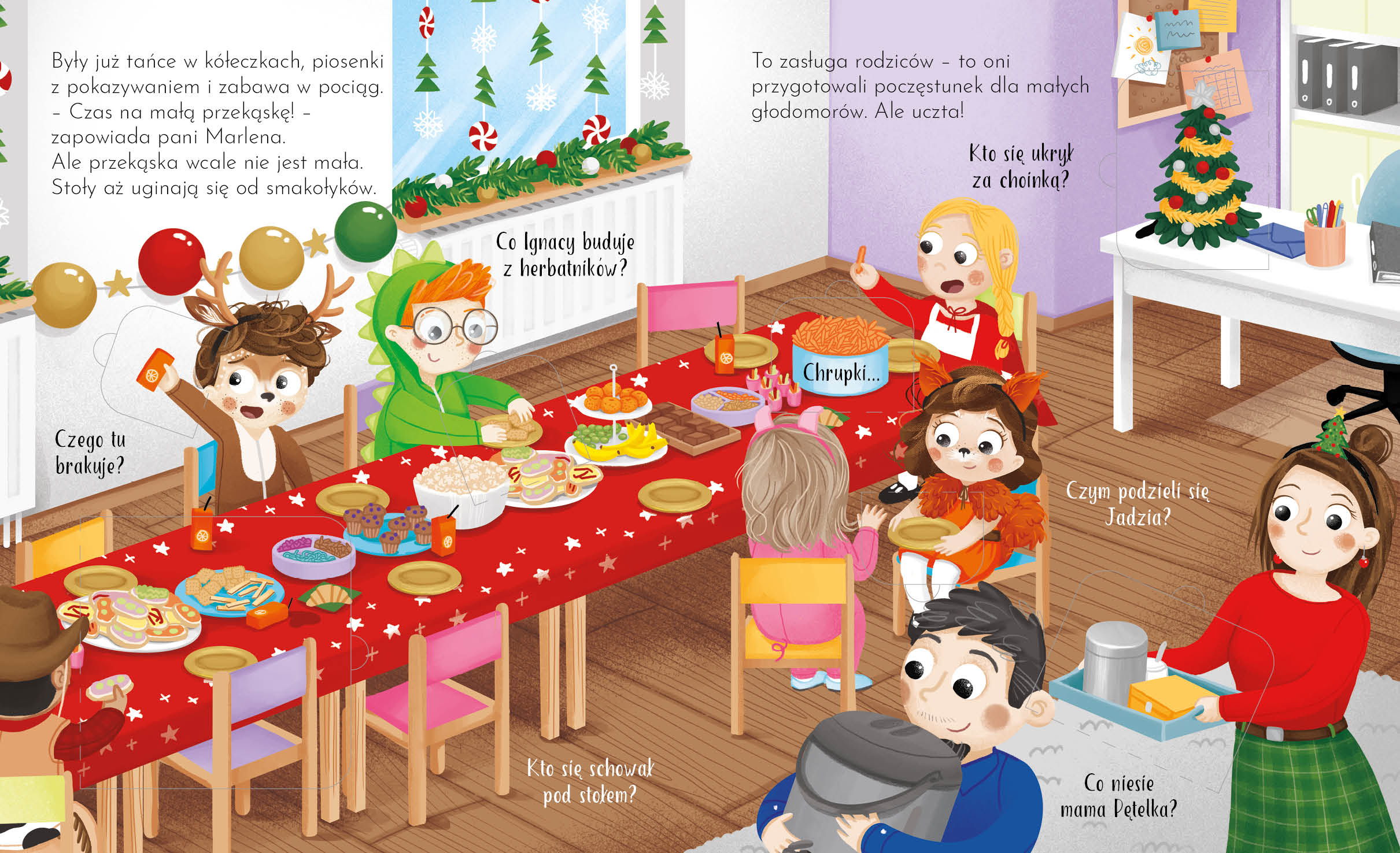 "Pętelkowy bal choinkowy" to duża kartonowa książka z okienkami, która zapewni najmłodszym świetną zabawę, a przy okazji pomoże ćwiczyć orientację przestrzenną oraz nazywanie przedmiotów. Na każdej rozkładówce rozmieszczono kilka otwieranych okienek, pod którymi ukryte zostały przedmioty nawiązujące do tekstu.