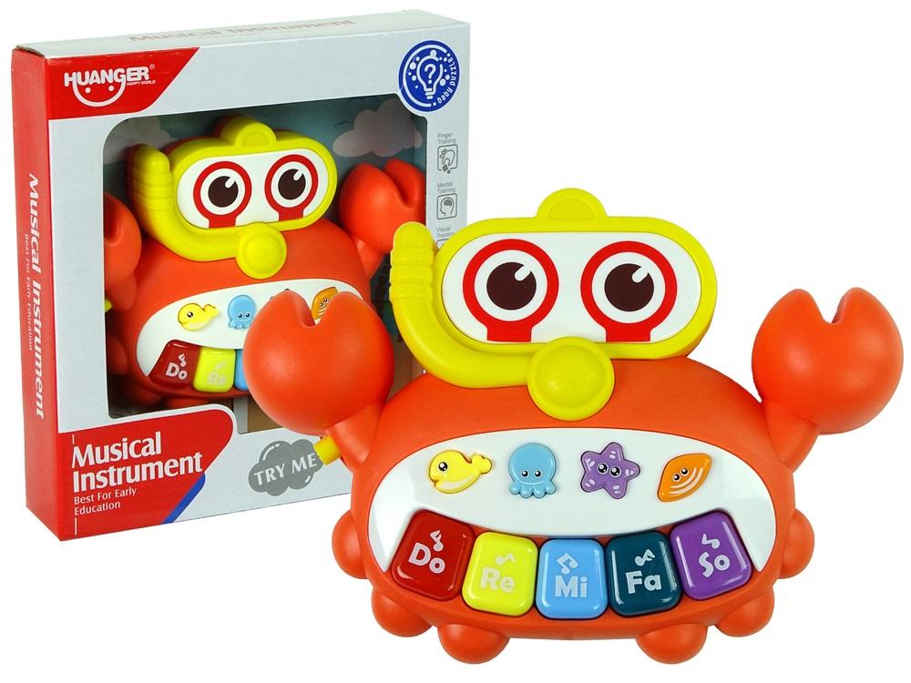 Muzyczne Pianinko Krab Zwierzątka Morskie Dźwięki Światła Prawidłowy rozwój, a także uśmiech na twarzy dziecka jest bardzo istotną kwestią w życiu każdego maluszka. Dzięki interaktywnym i muzycznym zabawkom wesoły grymas nie będzie schodzić z buźki dziecka. Zabawa z pianinkiem wyostrzy zmysł słuchu i wzroku maluszka. Pobudzi jego wyobraźnie i zachęci do poznawania świata. Pianinko posiada 5 przycisków muzycznych DO RE MI FA SO, w różnych kolorach z efektami świetlnymi, co dodatkowo skupi uwagę malucha. Dzięki różnorodnym dźwiękom może nauczyć się rozróżniać i poznawać nowe dźwięki, ale nie tylko. Małe przyciski w kształcie zwierząt morskich uruchamiają szereg innych funkcji. Zmieniają melodie, odtwarzają odgłosy zwierząt ( pies, kaczuszka), zmieniają dźwięki. Szereg dodatkowych zalet, które pomogą w rozwoju Twojego dziecka. Możliwość grania i komponowania swoich pierwszych utworów dostarczy dziecku wiele satysfakcji i mnóstwo radości. Wymiary pianinka: 18 cm x 14 cm x 3 cm Wymiary pudełka: 20 cm x 20 cm x 5 cm Pianinko przeznaczone jest dla dzieci powyżej 18 miesiąca życia. Zabawka posiada certyfikat CE i jest zgodna z normą EN 71. By zabawka działała prawidłowo, należy zasilić ją trzema sztukami baterii AAA 1,5 V, które są dołączone do zestawu. Organki posiadają certyfikat CE, zapakowane są w kolorowe pudełko, dzięki czemu nadaje się na prezent dla rodziców i ich malutkiej pociechy.