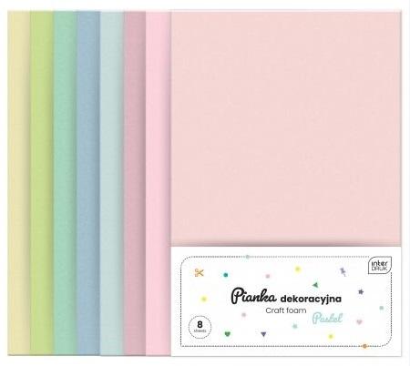 Opakowanie zawiera 8 arkuszy pianek w rozmiarze A4 w pastelowych kolorach.