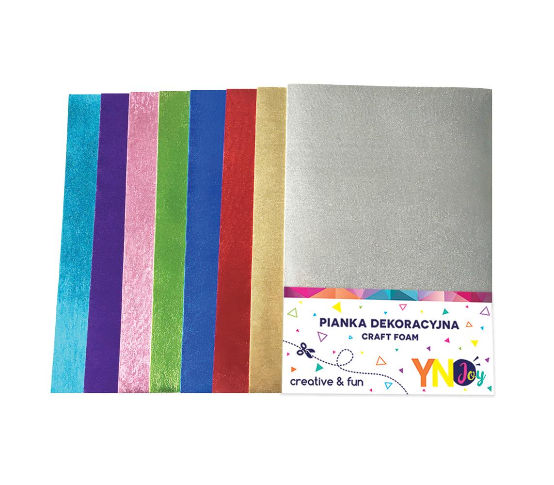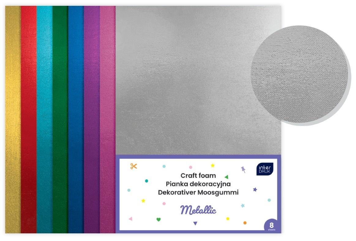 Opakowanie zawiera 8 arkuszy pianek w rozmiarze A4 w intensywnych kolorach i o metalicznym wykończeniu.