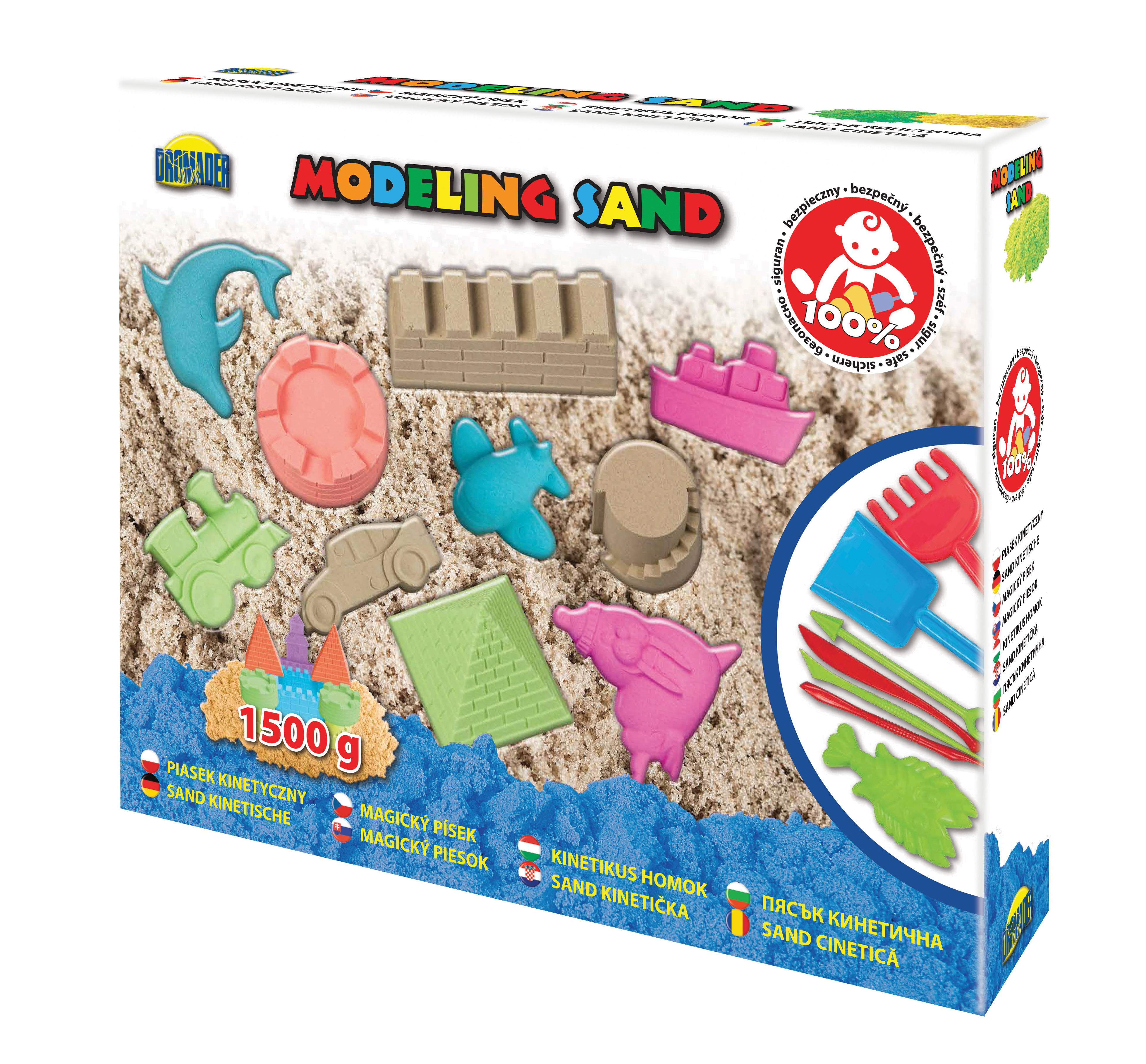 1500 gramów piasku kinetycznego w różnych kolorach w zestawie z foremkami, (10 sztuk), łopatką, grabkami i tekturową piaskownicą.