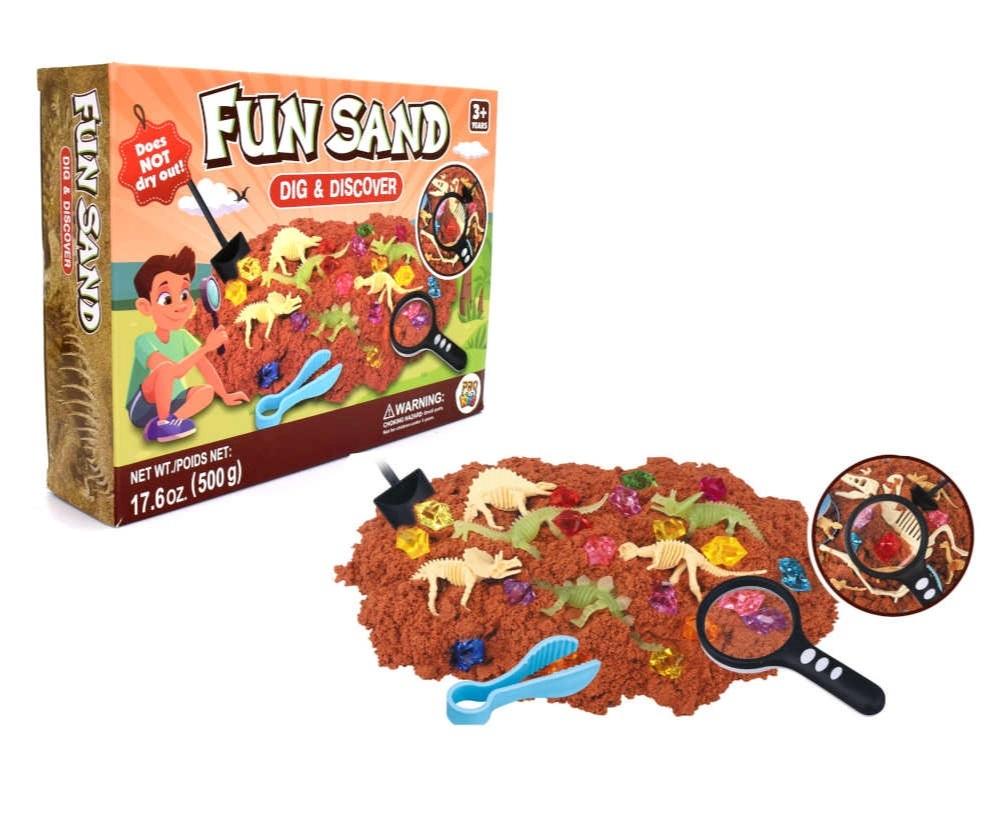 " Odkryj fascynujący świat dinozaurów i kryształów. Zakopane w piasku kinetycznym szkielety dinozaurów i kolorowe kryształki rozbudzają wyobraźnię i sprawiają, że poczujesz się jak na wykopaliskach. Łopatki, lupa i szczypce pozwalają wykopywać szkielety i je szczegółowo oglądać. Zestaw idealny do celów edukacyjnych, a kinetyczny piasek to świetna sensoryczna zabawa.