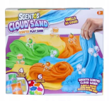 - w zestawie: pachnący piasek puszysty w czterech kolorach, 6 plastikowych foremek, 1 zabawkowa łyżka i 1 mata;