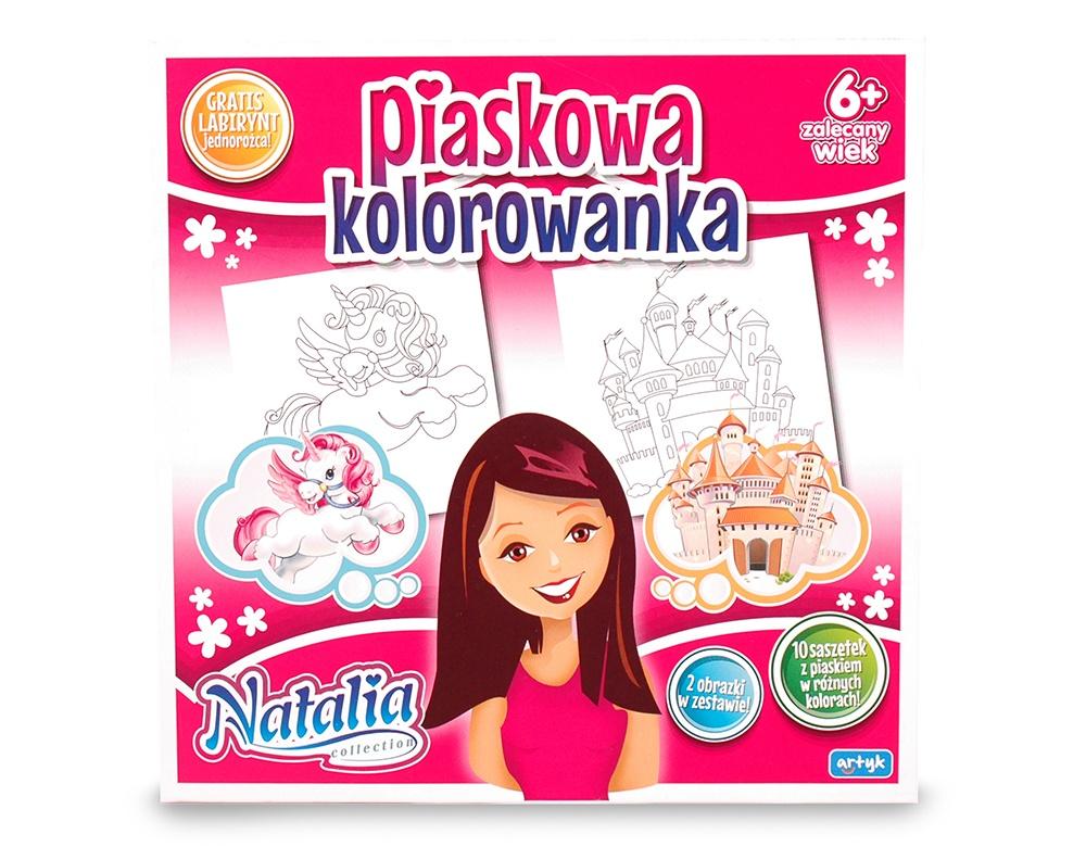 W ZESTAWIE: 2 TEKTUROWE ARKUSZE Z RYSUNKAMI (JEDNOROŻCA I ZAMKU) O WYM. 21 X 20 CM, 10 KOLORÓW PIASKU W WORECZKACH ORAZ LABIRYNT (TRZEBA ODNALEŹĆ DROGĘ DO ZAMKU). WYM. OPK.: 21 X 21 CM.