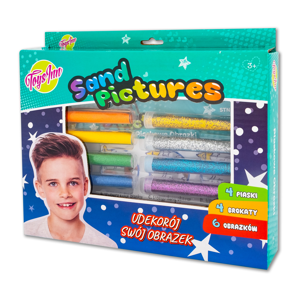 Zestaw zawiera: 4 kolory piasków, 4 brokaty, 6 obrazków.