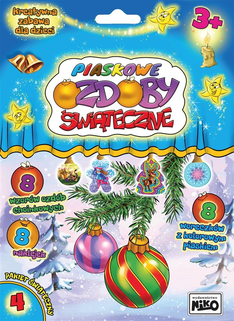 PIASKOWE OZDOBY ŚWIĄTECZNE to znakomita zabawa dla starszych i młodszych dzieci oraz całej rodziny. Każdy może stworzyć swoją niepowtarzalną dekorację świąteczną, którą ozdobi choinkę i dom. W opakowaniu znajdują się gotowe kartonowe elementy do wyjęcia, patyczek, woreczki z piaskiem (8 kolorów) i naklejki. Jak wykonać dekoracje? Delikatnie wypychamy ozdobę, którą chcemy wykonać i rozpoczynamy jej dekorowanie. Za pomocą patyczka odklejamy wybrany element dekoracji i ten lepki fragment posypujemy kolorowym piaskiem. Nadmiar piasku zsypujemy. Kolorujemy w ten sposób całą ozdobę. Następnie z drugiej strony przyklejamy odpowiednią naklejkę z zestawu.