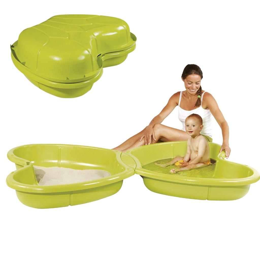 Piaskownica dwuczęściowa. Jedna może być wypełniona piaskiem, a druga