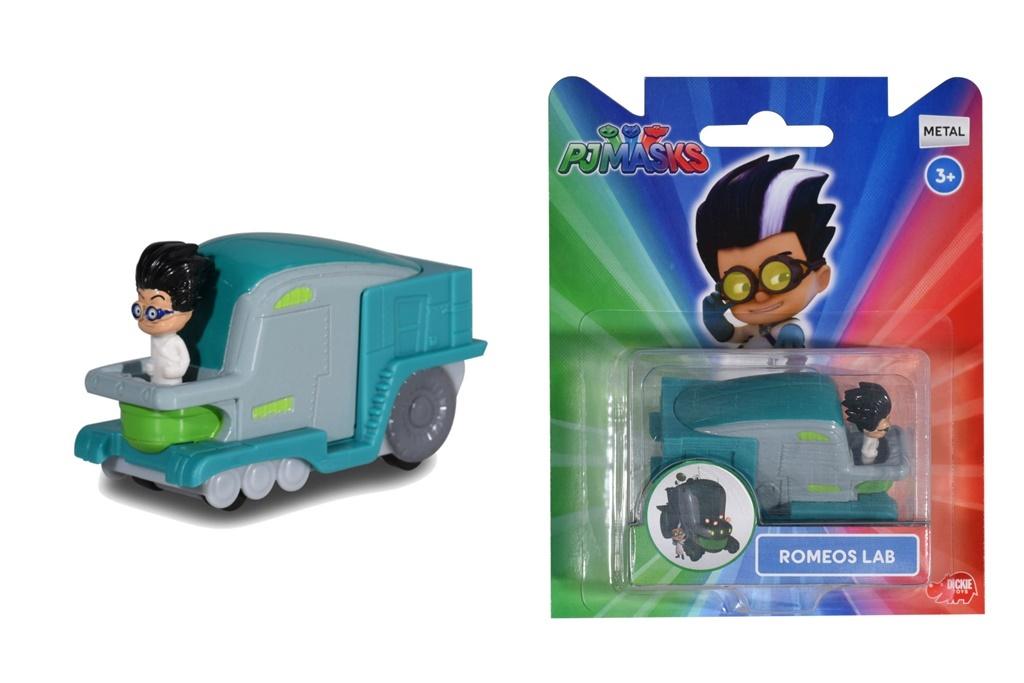 Pidżamersi Metalowy pojazd bez napędu - Romeo. Romeo to postać chłopca w białym fartuchu. Jest naukowcem. W zestawie znajduje się autko oraz figurka. Pojazd, który jest mobilnym laboratorium, ma plastikowe, ruchome koła umożliwiające mu poruszanie się po powierzchniach płaskich. wymiary pojazdu z figurką: 7.0 x 3.5 x 4.0 cm,