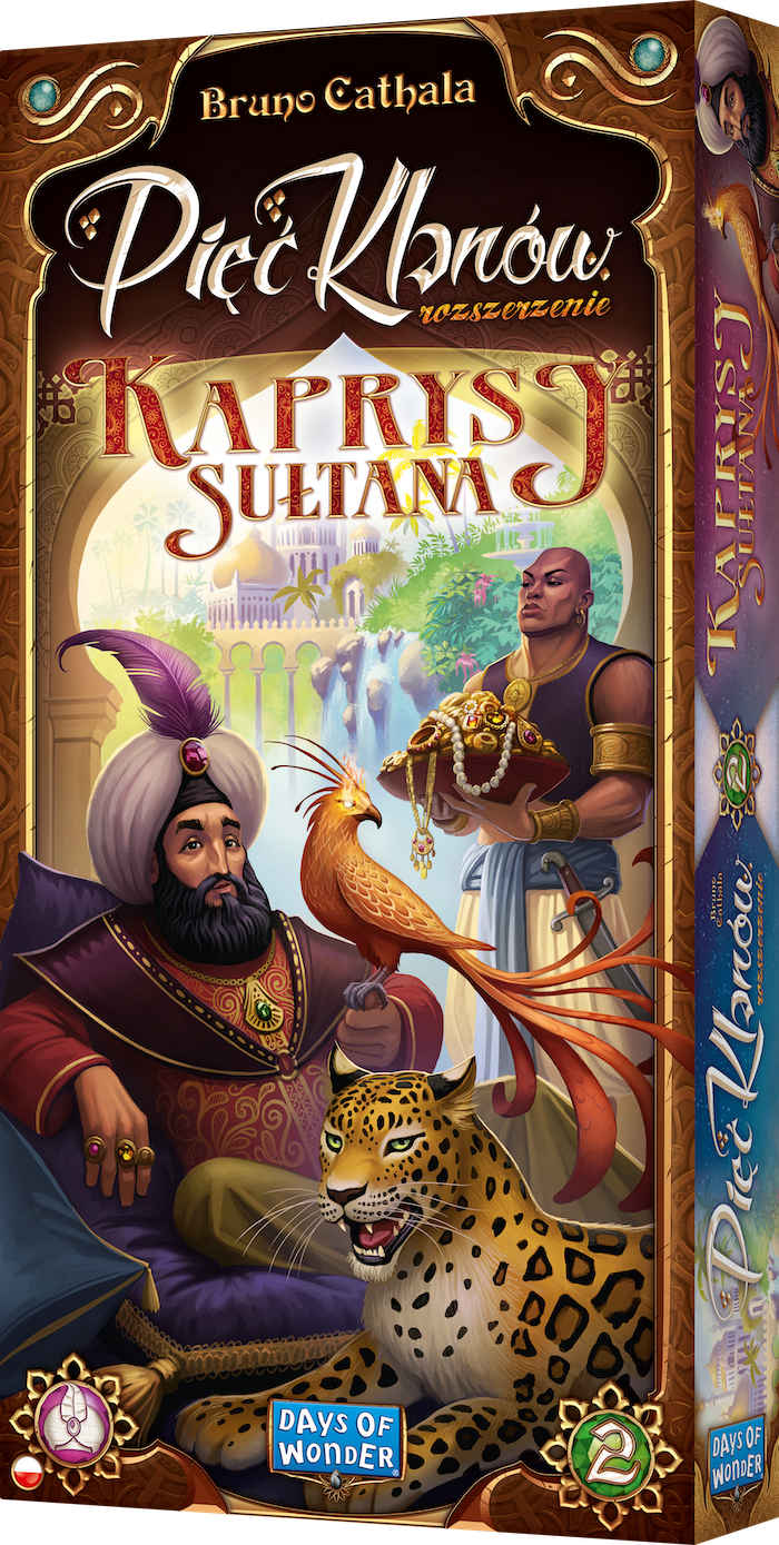 Bujny rozkwit Sułtanatu Naqali przyci±gn±ł wielu zainteresowanych - co najmniej tylu, ile ziarenek piasku liczy pustynia. Będziesz więc musiał nauczyć się kilku nowych sztuczek, aby utrzymać się na szczycie Zwłaszcza że sułtan założył 5 cudownych miast, nad którymi każdy chciałby przej±ć kontrolę. Powiadaj± również, że sułtan ma w zwyczaju pojawiać się na posiedzeniach w tych miastach i wyznaczać ogromne nagrody śmiałkom gotowym spełnić jego zachcianki. Czy sprostasz temu wyzwaniu?   Rozszerzenie Kaprysy sułtana pozwala 5 graczom rywalizować o kontrolę nad 5 cudownymi miastami i spełniać życzenia sułtana.    Co wprowadza dodatek?   Możliwość zaproszenia do stołu 5. gracza. W tym celu będziemy wykorzystywać nowy tor licytacji i tor kolejności oraz dodatkowe płytki - mog± pochodzić z rozszerzenia Kaprysy Sułtana lub Rzemieślnicy Naqali (szczegółowe zasady ł±czenia dodatków s± podane w instrukcji). Płytki wielkiego jeziora, które będzie pomnażało punkty za przyległe do niego palmy. 5 płytek cudownych miast. Przejęcie kontroli nad nimi (i uniemożliwienie tego pozostałym!) będzie stanowiło ważny cel dla wszystkich uczestników. Jeśli któremuś z graczy uda się przej±ć wszystkie 5 miast, otrzyma aż 125 punktów! Karty kaprysów Sułtana, które otrzymujemy, gdy zakończymy swój ruch w którymś z cudownych miast. Jeśli spełnimy warunki, które postawił przed nami władca, zostaniemy obsypani złotem! 2 nowe karty dżinów ze specjalnymi umiejętnościami.   Czym jest Pięć Klanów?   To strategiczna gra z modularn± plansz±, w której wcielamy się w obcokrajowców przybywaj±cych do legendarnego państwa-miasta Naqali. Manipuluj±c tytułowymi klanami, a także bior±c na służbę prastare dżiny, będziemy próbowali zdobyć wpływy w mieście. Zwycięży osoba, która zdobędzie najwiecej punktów z dóbr zgromadzonych podczas gry, zebranych płytek oraz pozyskanych sojuszników.