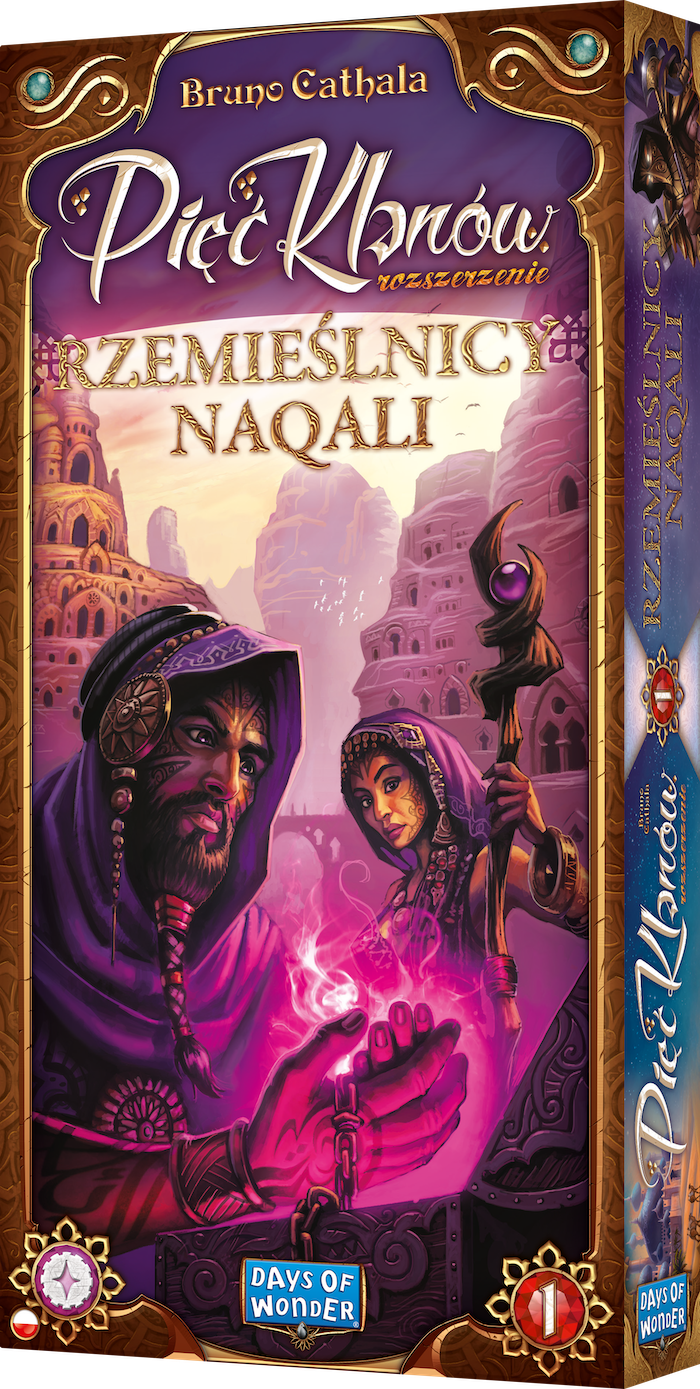 Powiadaj±, że w samym sercu gór Sułtanatu Naqali żyje klan, który bardzo rzadko odwiedza bazary i targowiska miasta. To rzemieślnicy. Dzień i noc wytwarzaj± kosztowności inkrustowane rzadkimi klejnotami. Niektórzy podróżnicy utrzymuj± nawet, że przedstawiciele tego skrytego klanu potrafi± stworzyć unikalne, osnute tajemnic± magiczne przedmioty.   Rozszerzenie Rzemieślnicy Naqali wprowadza do gry nowy klan. Wykorzystaj jego talenty i przedmioty, aby pokonać przeciwników i obj±ć władzę w Sułtanacie!    Co wprowadza dodatek?   Klan fioletowych rzemieślników, którzy doł±czaj± do puli podstawowej. Dzięki nim gracze mog± zdobywać specjalne przedmioty: te drogocenne przynosz± punkty na koniec gry, natomiast te magiczne zapewniaj± specjalne efekty w tracie rozgrywki. 6 nowych płytek, które będziemy umieszczali w centralnej części Naqali, w tym takie, które będ± utrudniały poruszanie się po planszy. 4 karty dżinów (2 nowe i 2 poprawione) z nowymi działaniami. Namioty, które działaj± podobnie jak wielbł±dy, z t± różnic±, że zapewniaj± dodatkowe punktu zwycięstwa za s±siedztwo czerwonych płytek.   Czym jest Pięć Klanów?   To strategiczna gra z modularn± plansz±, w której wcielamy się w obcokrajowców przybywaj±cych do legendarnego państwa-miasta Naqali. Manipuluj±c tytułowymi klanami, a także bior±c na służbę prastare dżiny, będziemy próbowali zdobyć wpływy w mieście. Zwycięży osoba, która zdobędzie najwiecej punktów z dóbr zgromadzonych podczas gry, zebranych płytek oraz pozyskanych sojuszników.