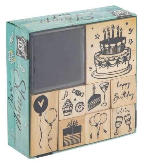 Zestaw 8 sztuk drewnianych pieczątek z kałamarzem. Opakowanie o wymiarach : 8,5 x 8,5 x 3 cm. Wzory przedstawiające symbole przyjęcia urodzinowego. Zabawka idealna do zabawy w "Pocztę" albo do ozdabiania swoich rysunków. Przeznaczone dla dzieci powyżej 3 roku życia.