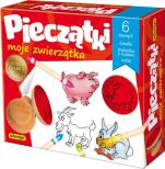 Zestaw 6 drewnianych pieczątek do kolorowania. W pudełku, oprócz stempli, znajduje się blok rysunkowy, zestaw 12 kredek oraz poduszka z tuszem. Kreatywna zabawa dla najmłodszych!