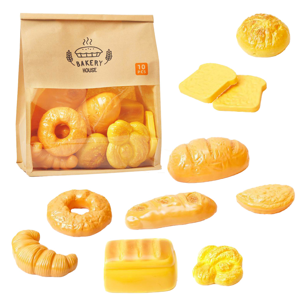 W zestawie znajduje się 10 elementów, w tym bułeczka, rogalik, mini babka oraz ciasto z dziurką.