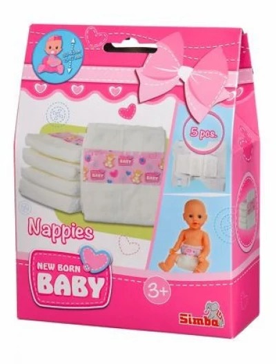 Zestaw 5 pieluszek dla lalek o wysokości 38-43 cm. Zestaw zapakowany w