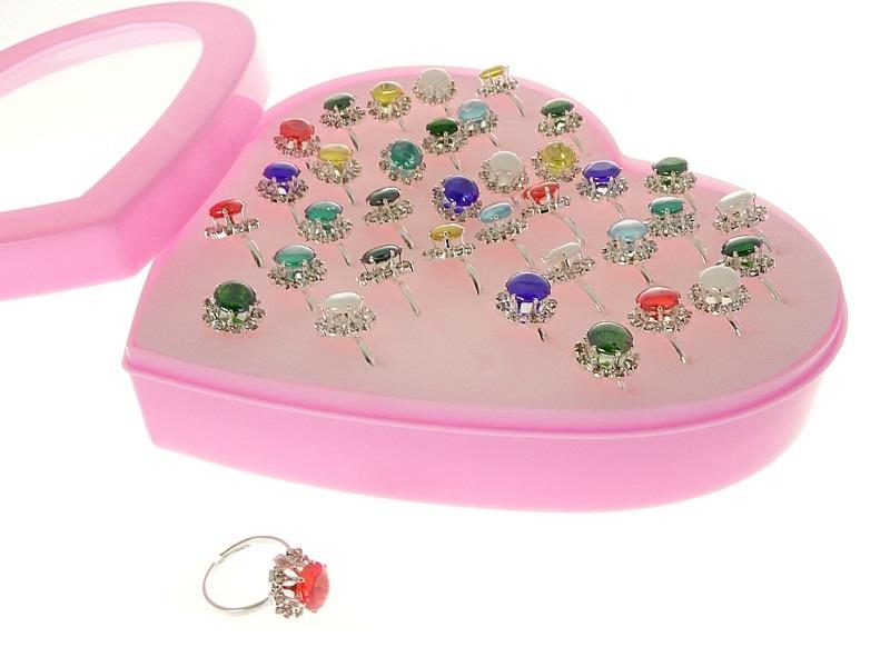 zestaw 36 pierścionków, regulowane w plastikowym etui - serce; Box