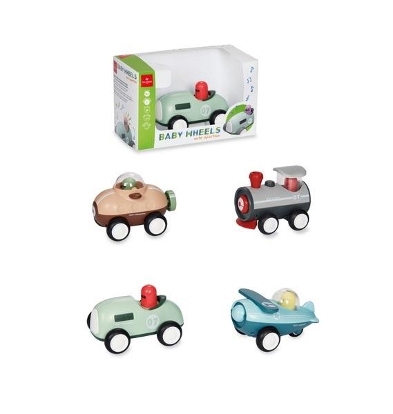 Pierwszy pojazd (13 cm) dla miłośnika motoryzacji. Dużo kreatywnej zabawy i radości. Auto sprawdzi się w domowych wyścigach, w ogrodzie, na plaży. Jest doskonale wykonane, lekkie, zwrotne i nie posiada ostrych krawędzi. Występują 4 modele (każdy po 2 szt): samolot, lokomotywa, samochód, łódź podwodna. Pojazdy wyposażone są w światełko, muzykę oraz napęd pull back. Baterie w zestawie. Styl baaardzo retro!