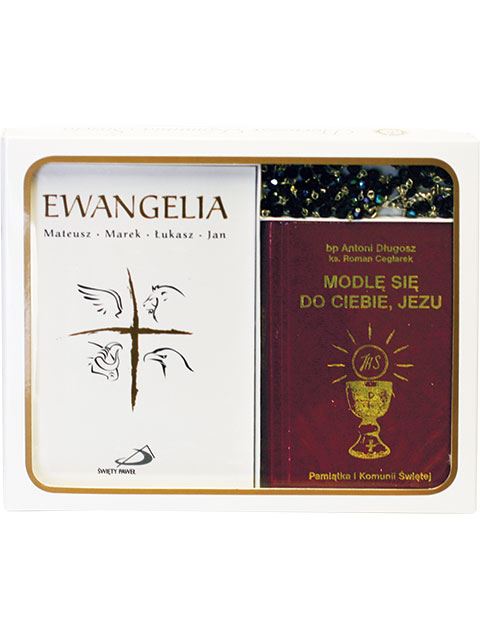 Trzy w jednym, czyli Ewangelia, modlitewnik i różaniec. To, co każde dziecko powinno dostać z okazji Pierwszej Komunii Świętej, zapakowane w eleganckie, prezentowe pudełko. Doskonały prezent od rodziców, dziadków, rodziców chrzestnych czy innych gości, ale także stosowny i elegancki upominek od proboszcza.