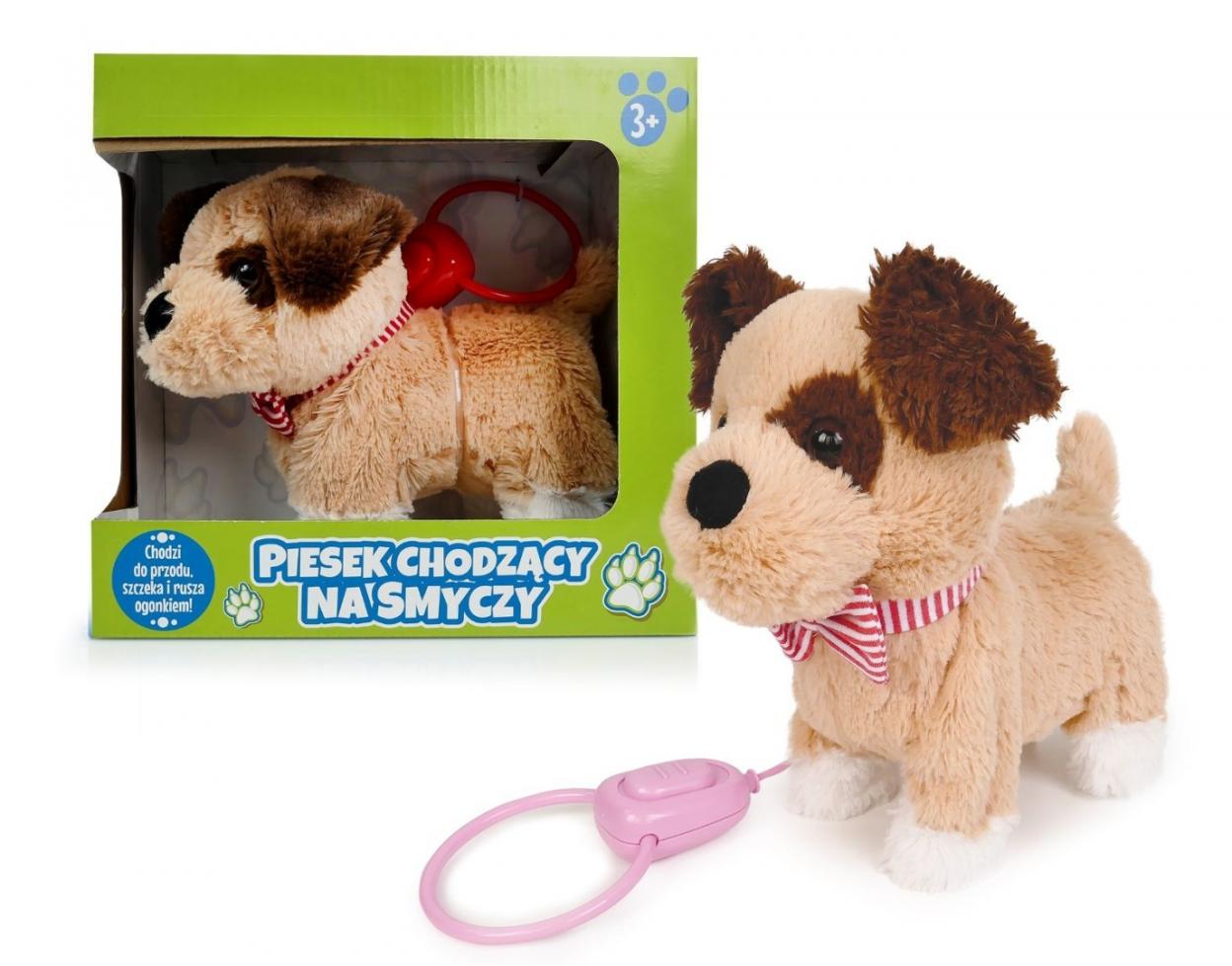W zestawie: piesek na smyczy 21 cm, funkcje: chodzi do przodu, szczeka, macha ogonem, wym. opakowania: 24,5 x 28 x 12,5 cm, baterie: 3 x AA niedołączone, 3+
