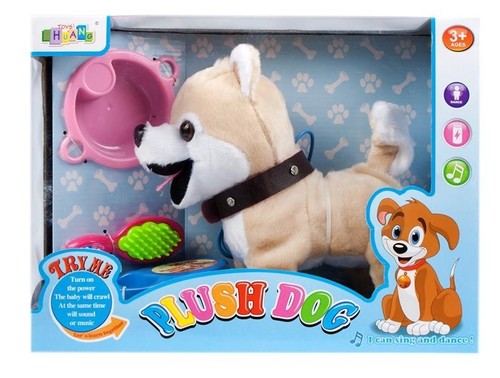 Interaktywna maskotka - pluszowy piesek. Chodzi na smyczy i tańczy. W komplecie miska i szczotka. Wymaga 3 baterii AA Zabawka dla dzieci w wieku od 3 lat.