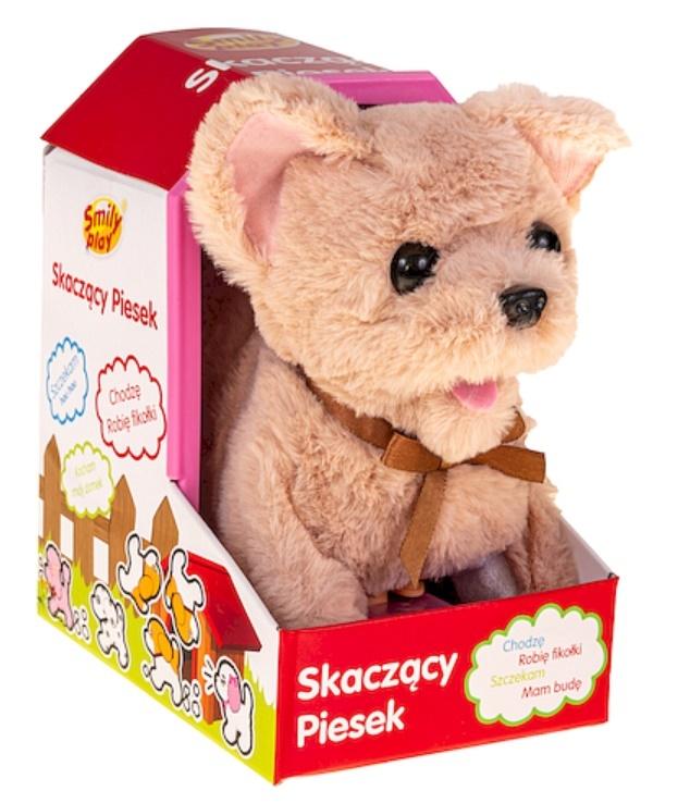 Pokryty pluszem piesek rasy chihuahua, chodzi do przodu i skacze do góry robiąc salto w powietrzu! W ruchu szczeka radośnie i rusza głową. Pod brodą, jako obrożę, ma uroczą, brązową kokardkę. Piesek ma miłe w dotyku dwukolorowe futerko.
