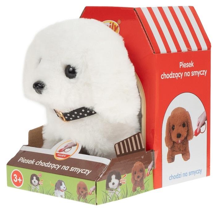 Łatwość obsługi: Piesek jest łatwy w obsłudze. Wystarczy włączyć go za pomocą przycisku, aby zaczął się ruszać i wydawać dźwięki, chodzi prowadzany na smyczy .