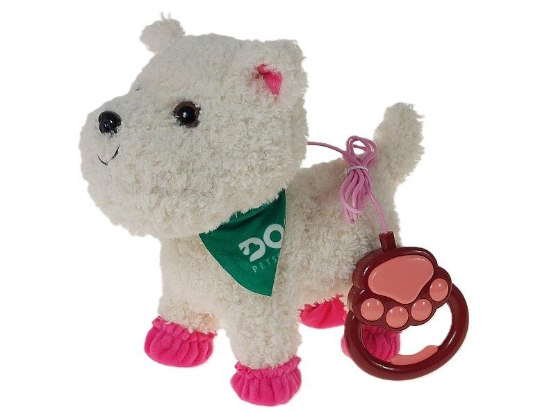 piesek chodzący na smyczy, reaguje na dźwięki, szczeka; 23x23x11cm, W/B