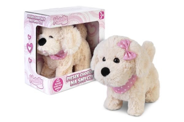 Piesek udekorowany różową chustką oraz różową kokardką w białe kropki. Ma wielkość 21 cm. Piesek posiada różne funkcje: chodzi, szczeka, merda ogonkiem. Do pieska dołączono różową smycz. Na opakowaniu znajduje się instrukcja obsługi smyczy. Zabawka wymaga 3 baterii AA 1,5V (nie dołączono do zestawu).