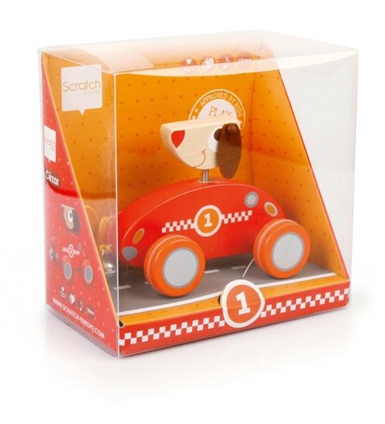 Zabawka nie pozostawia śladów na podłodze dzięki gumowym paskom, w które zostały wyposażone łapy pieska. Produkt wykonany z drewna.