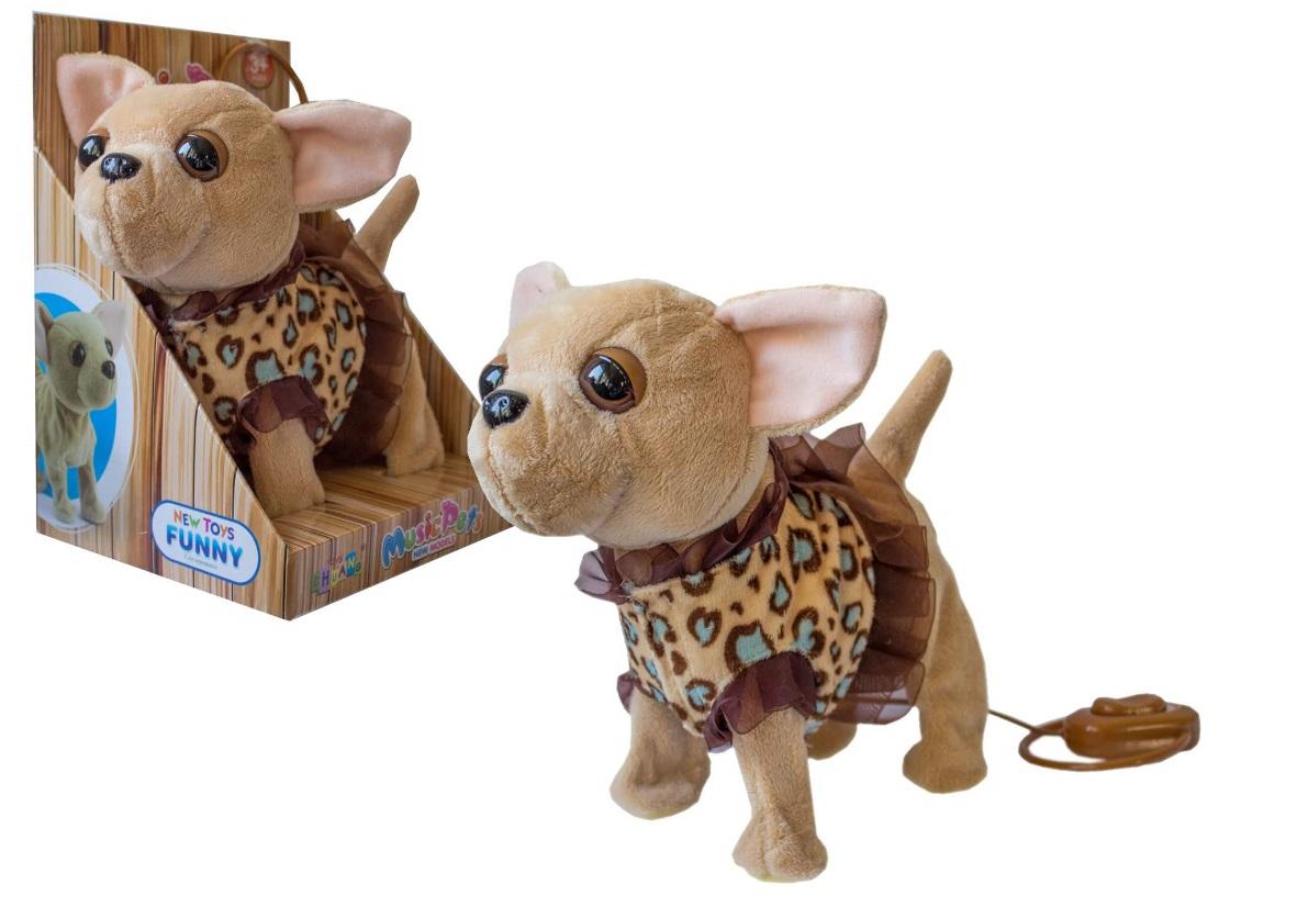 Piesek chodzi, wydaję dźwięki. Można go prowadzić na smyczy. Ubrany w najmodniejszy w tym sezonie- wzór, zasilanie 3xAA (nie są dołączone)