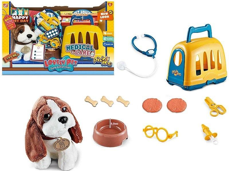 Piesek z klatką do przenoszenia, z akcesoriami; 46x30x16cm, W/B