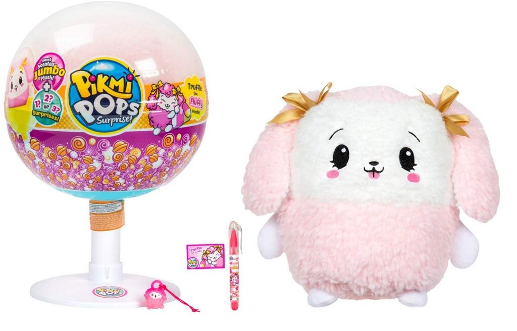 Pikmi Pops Jumbo to duży pluszak Pudel i wiele słodkich niespodzianek dla Ciebie! Każdy Pikmi Pops Jumbo jest wyposażony w 1 zapachowy pluszak, do 3 akcesoria, 1 wiadomość niespodzianka i 1 stojak.