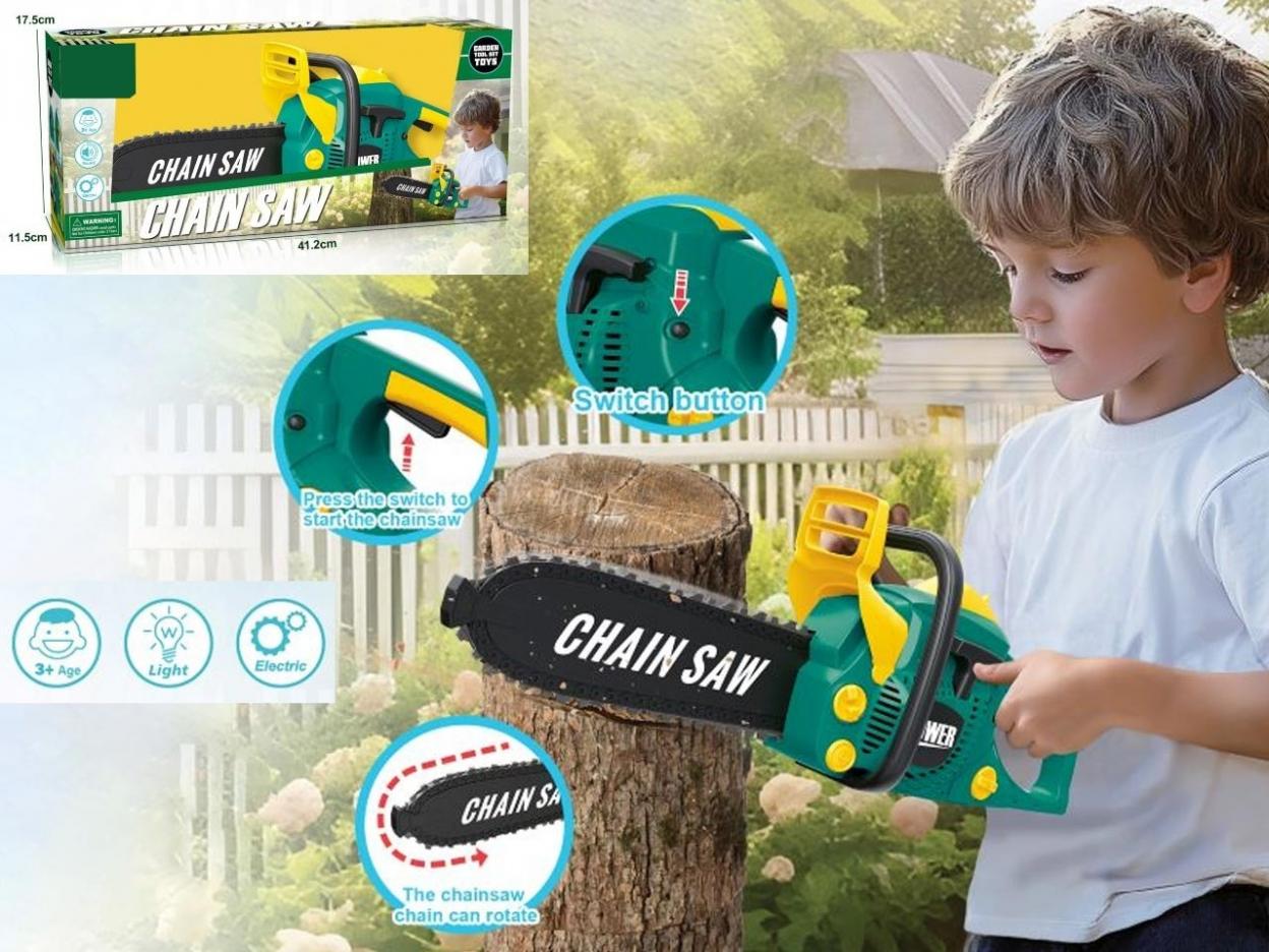 Realistyczna piła łańcuchowa dla małego majsterkowicza! Zabawka została wyposażona w obracający się (bezpieczny) łańcuch oraz efekt świetlny, które uruchamiane są po naciśnięciu przycisku. Dzięki realistycznemu wyglądowi i wygodnemu uchwytowi dziecko może wcielić się w rolę pomocnika w ogrodzie lub przy domowych pracach. To świetny sposób na rozwijanie wyobraźni, koordynacji ruchowej oraz kreatywnej zabawy w naśladowanie dorosłych. Najważniejsze cechy: obracający się, bezpieczny łańcuch; efekt świetlny; przycisk uruchamiający; zasilanie bateryjne. Dla dzieci 3+. Wymiary opakowania: 41,2 17,5 11,5 cm. Idealny prezent dla małego fana narzędzi i prac ogrodowych.