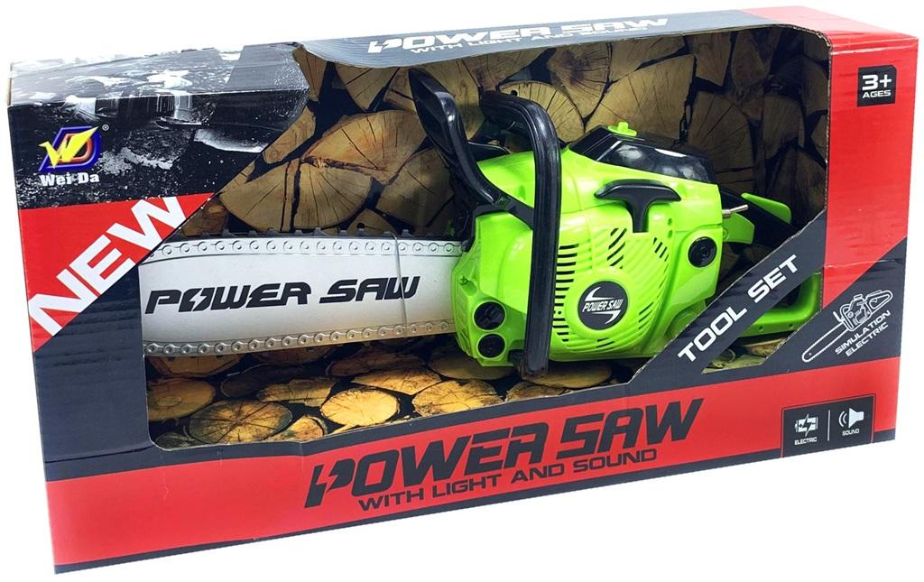 Zabawkowa piła spalinowa na baterie. Na bagnecie piły porusza się łańcuch, piła wydaje dźwięki.
