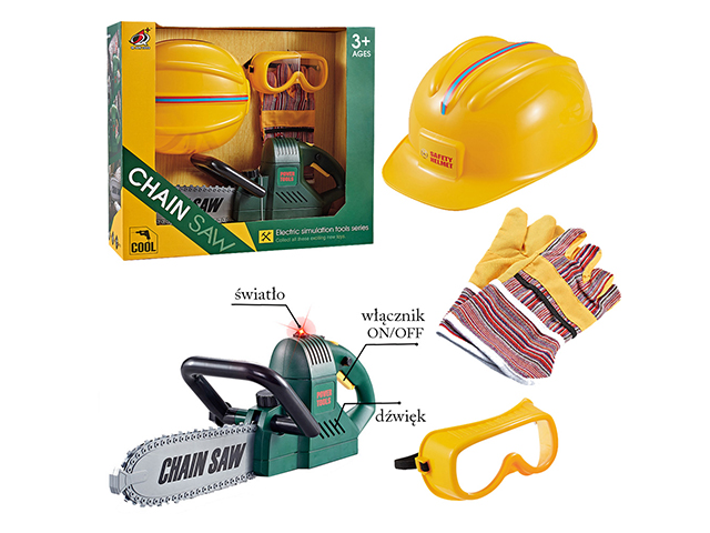 Zestaw zawiera kask, gogle i rękawice ochronne oraz zabawkową piłę łańcuchową z efektami świetlnymi i dźwiękowymi.