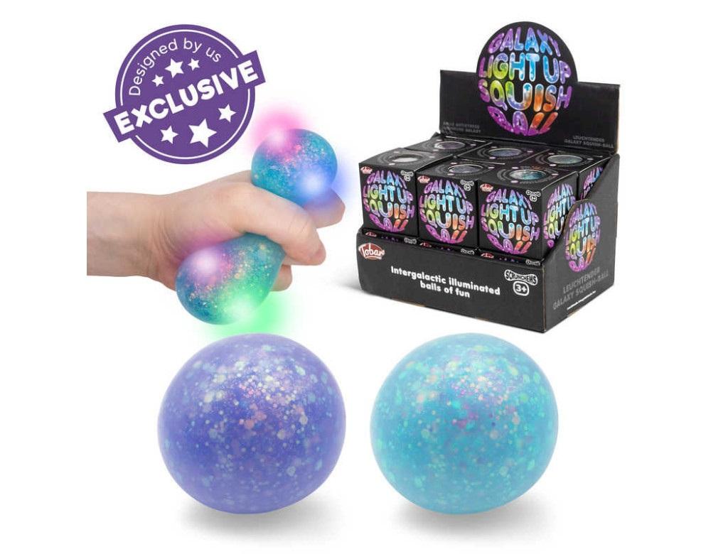 Wypełniona żelem kulka z galaktycznym brokatem. Ściśnij piłkę, a jej błyszczące boki wybrzuszą się. Co więcej, zapukaj, a wnętrze rozświetli się kolorowymi, migającymi światłami. Tworzy także fantastycznie efektowną alternatywną piłkę antystresową. Dostępny w dwóch różnych kolorach inspirowanych galaktyką do wyboru. Wysokość produktu: 6cm.