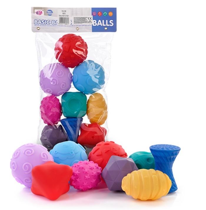 W ZESTAWIE: 9 MIĘKKICH PIŁECZEK SENSORYCZNYCH W RÓŻNYCH KSZTAŁTACH, KOLORACH I ROZMIARACH, WYM. OPK: 35 X 20 X 7 CM., 3+
