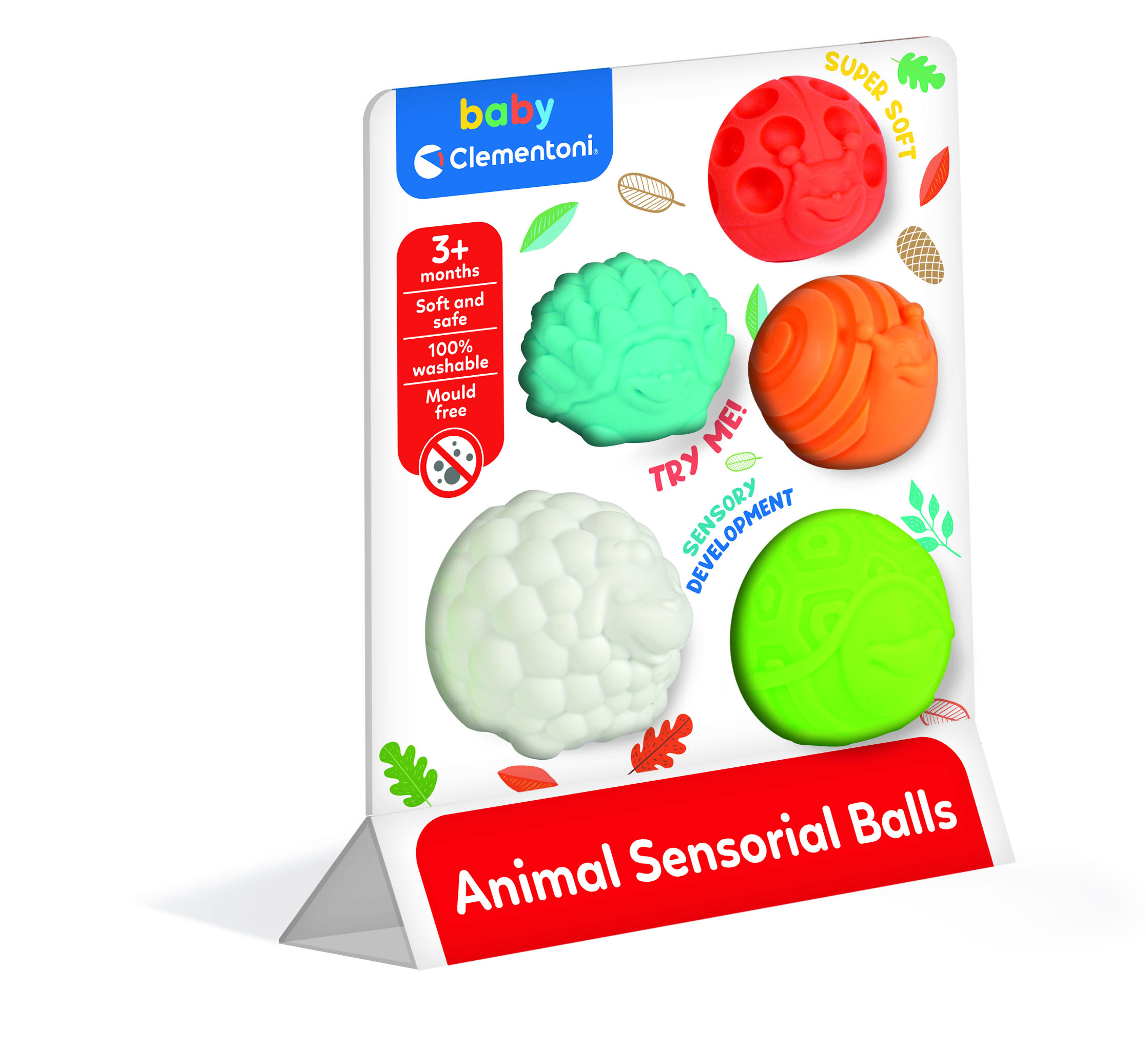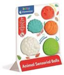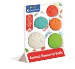Zestaw pięciu miękkich piłeczek w kształcie zwierzątek.