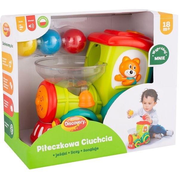 ciuchcia jeździ przy dźwiękach piosenki, żonglując piłeczkami,