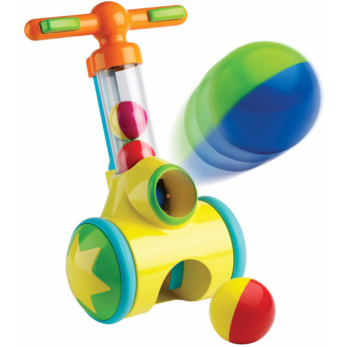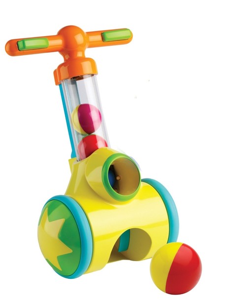 Piłeczkowy jeździk zbiera piłeczki z podłogi, a następnie wystrzeliwuje je po naciśnięciu przycisku na rączce. Zabawka zachęca do aktywności i rozwija koordynację ruchową. Dla dzieci w wieku od 18 miesięcy.