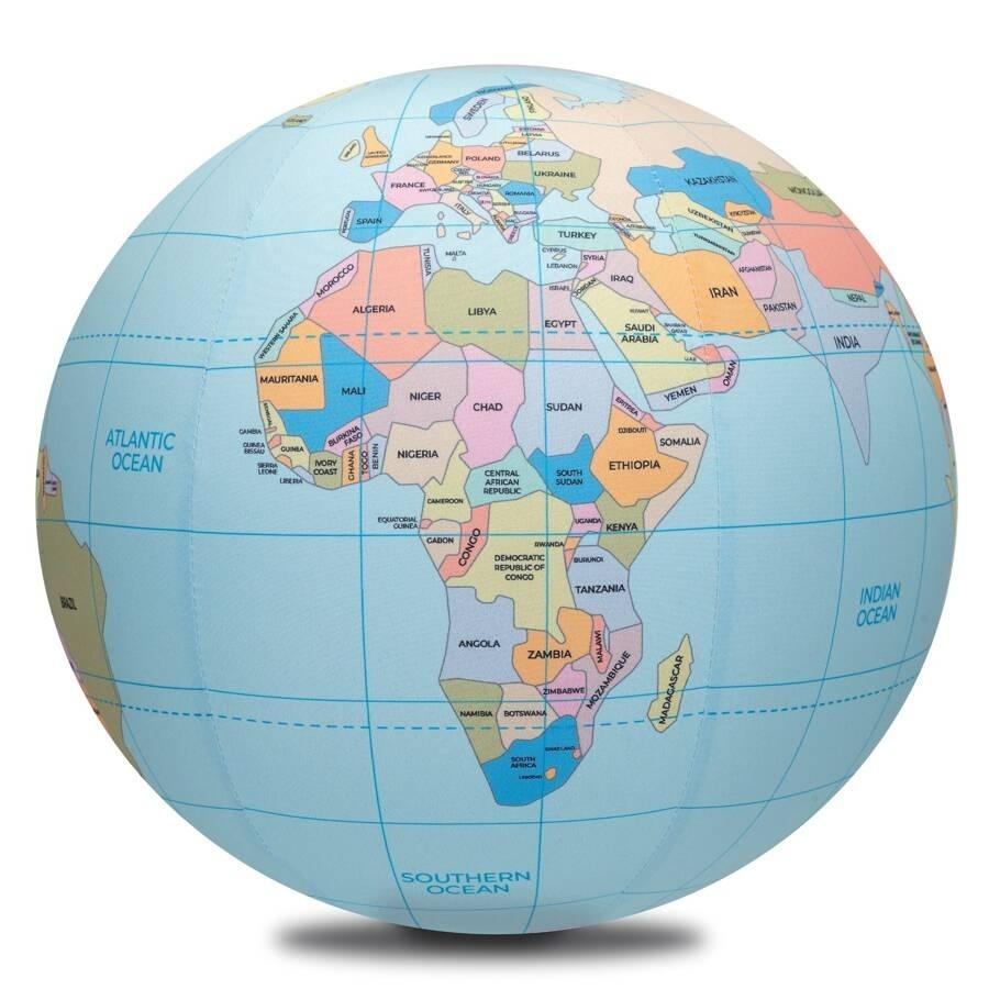 Jedyna taka, niepowtarzalna piłka globus z zaznaczonymi państwami świata oraz ich nazwami w języku angielskim.