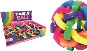 12 szt/disp, śr. piłki 7 cm, piłka składa się z plątaniny gumowych pasków, można ją odbijać, gnieść, rzucać, wym. disp. 29,5 x 21,5 x 7,5 cm, 3+