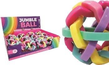 Opis: 12 szt/disp, śr. piłki 7 cm, piłka składa się z plątaniny gumowych pasków, można ją odbijać, gnieść, rzucać, wym. disp. 29,5 x 21,5 x 7,5 cm, 3+