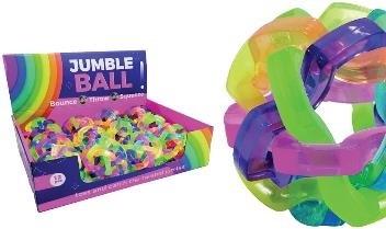 Opis: 12 szt/disp, śr. piłki 7 cm, piłka składa się z plątaniny gumowych pasków, można ją odbijać, gnieść, rzucać, wym. disp. 29,5 x 21,5 x 7,5 cm, 3+