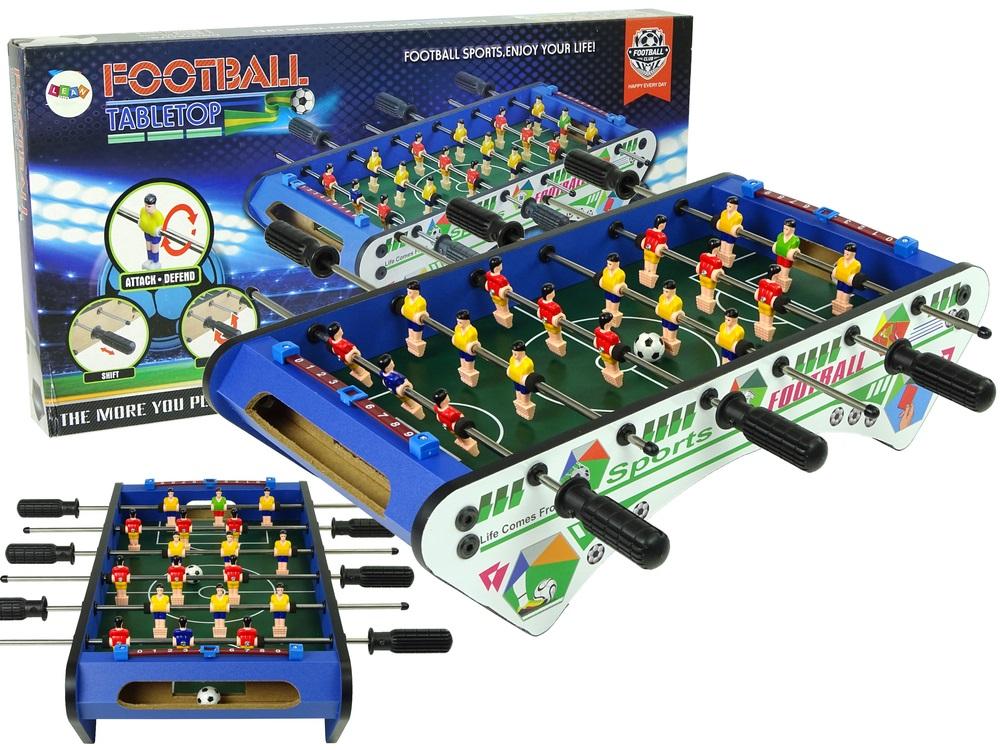 Piłkarzyki Gra Stołowa Piłka Nożna Dwóch Graczy 50 cm Zagraj z dziećmi w piłkę nożną bez wychodzenia z ciepłego domu! Gra Piłkarzyki to bardzo znana i popularna zabawa. Budzi emocje, rywalizację. Dzięki prostym i jasnym zasadom wciągnie każdego najmłodszego do zabawy. Rozwinie zwinność i precyzję oraz nauczy zasad gry. Gra rozpoczyna się, gdy wezmą w niej udział co najmniej 2 osoby - im więcej zawodników, tym lepsza zabawa. Zestaw to 2 pełne drużyny czerwoni i żółci, po 6 zawodników na drużynę razem z bramkarzami. Dzięki uchwytom można ruszać po wyznaczonych trasach, aby podać piłkę albo obronić gol. Poręczne gałeczki dobrze leżą w dłoni, dzięki czemu drążki są łatwe w nawigacji zawodnikami. Dziecko będzie mogło stoczyć prawdziwy ekscytujący mecz. Po dwóch stronach została zamontowana taśma z liczbami, gdzie można liczyć gole. Rozpocznij rywalizację i zostań mistrzem piłki nożnej. Rozmiary boiska pozwalają na zabawę nawet w niedużych pomieszczeniach, można rozłożyć je na stole lub na podłodze, będzie elementem wystroju pokoju dziecka. Wymiary stolika: 50 cm x 25 cm x 13 cm Wymiary opakowania : 51 cm x 27 cm x 6 cm Gra przeznaczony jest dla dzieci powyżej 6 roku życia. Zabawka posiada certyfikat CE i jest zgodna z normą EN 71. Zapakowana jest w kartonik, dzięki czemu nadaje się na prezent dla dziecka.