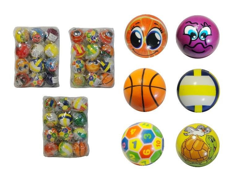 Kolorowa, mięciutka piłeczka z motywem zwierzątek, minek, sportowym, owocowym, w cyferki. Produkt zapakowany w przezroczysty worek. Produkt występuje w kilku wersjach kolorystycznych, wybierany losowo. Cena dotyczy jednej sztuki. Podane wymiary są przybliżonymi wymiarami piłki.