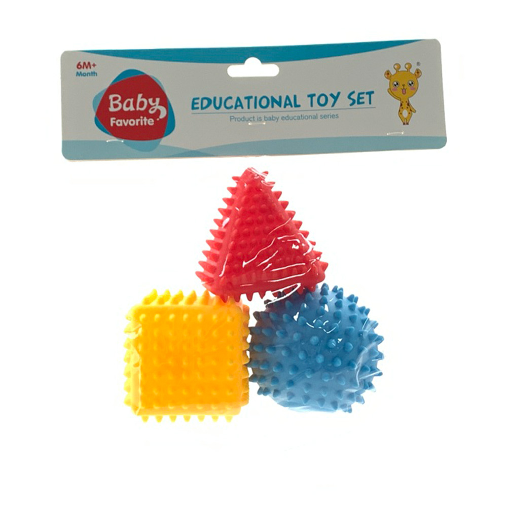 Zestaw trzech piłek sensorycznych w kształcie kuli, kwadratu i trójkąta.