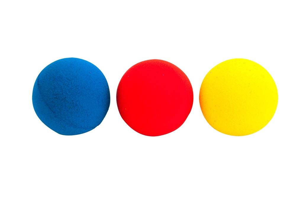 Zestaw 3 kolorowych piłeczek z gąbki o średnicy 70 mm. Dostępne w różnych wariantach kolorystycznych.