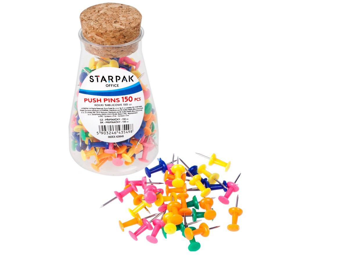 Kolorowe kołki tablicowe w poręcznym, oryginalnym opakowaniu. Niezbędny element wyposażenia każdego biura, przydatne również w domu iw szkole. Opakowanie zawiera 150 sztuk w mixie kolorów.